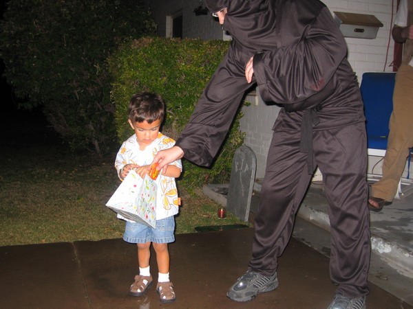 Uncle Sean, the Ninja, gives Aidan his first treat for the night