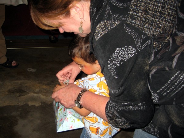 Grand-aunt Laurie helps Aidan get his candy in the bag