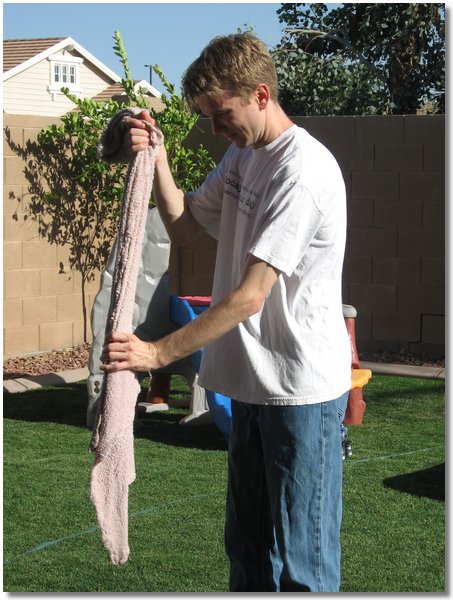 Daddy wrings out Caitlin's lovey