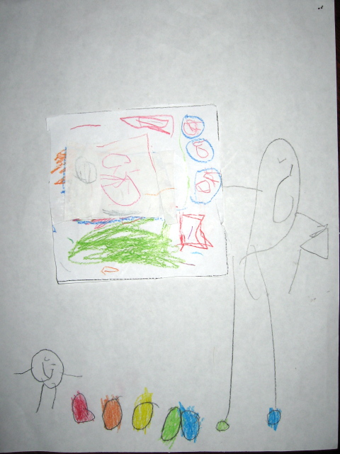 Aidan drew this picture in early October 2008. William could not figure out what Aidan had drawn but I knew immediately. The little smiley circle on the left is Aidan. He is watching his dad (big smiley circle on the right) play guitar hero (the triangle is the guitar). The big white square in the middle is the TV and the colored circles at the bottom of the page represents the colored guitar strokes for the game. |