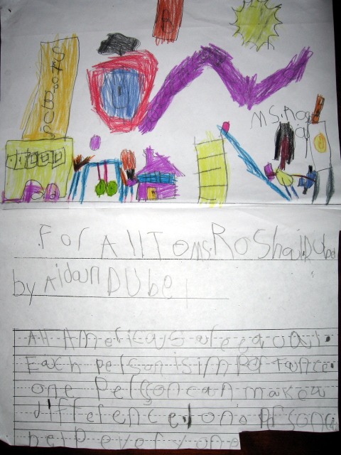 This was one of Aidan's first writing pieces. I don't know the exact date of when he wrote this but I believe this was written in early spring of this year. |