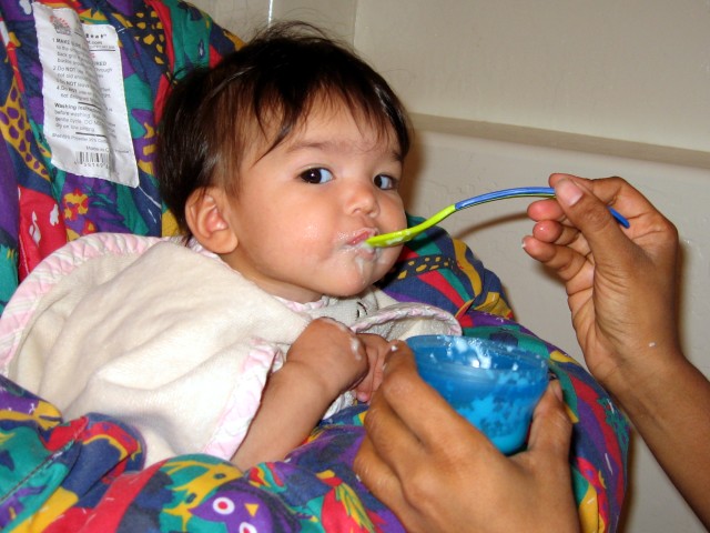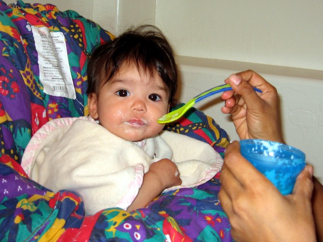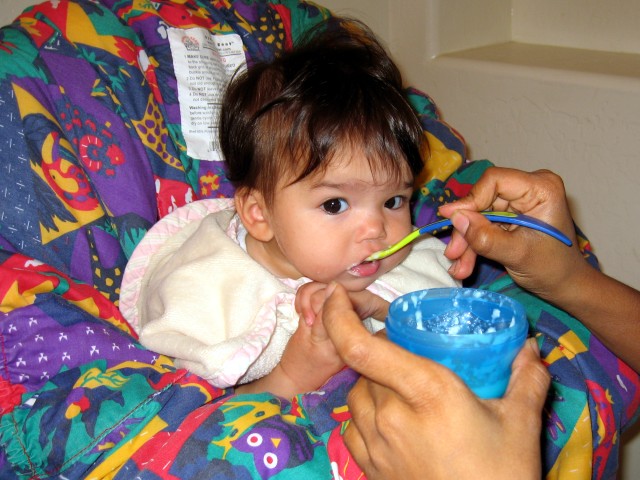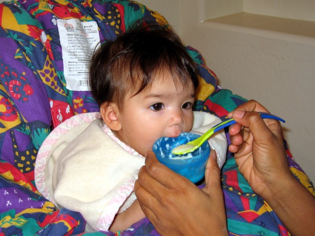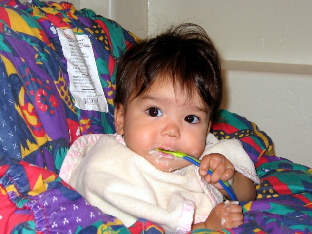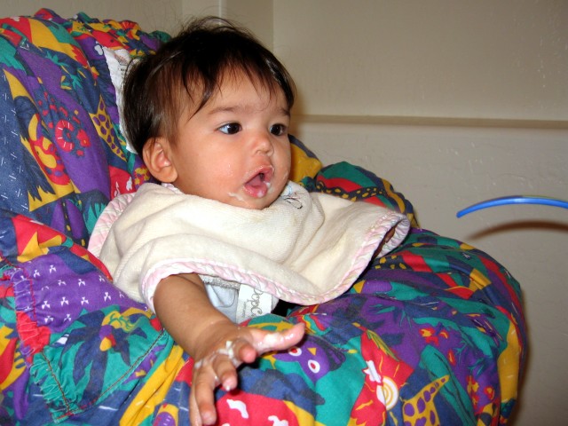 For the past month or so Caitlin has been showing signs that she was ready for solid food, but I wasn't ready for her to graduate from nursing to solids. Alas, she can't be my baby girl forever so on March 02, 2008, a day before her six month birthday, Caitlin had her first taste of solid food. She was so excited after her first bite, she tried to jump out of her chair for more. Needless to say, she wolfed it all down. |