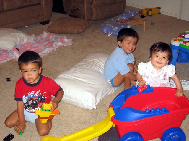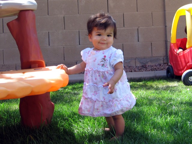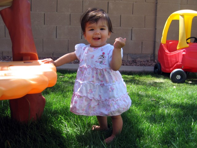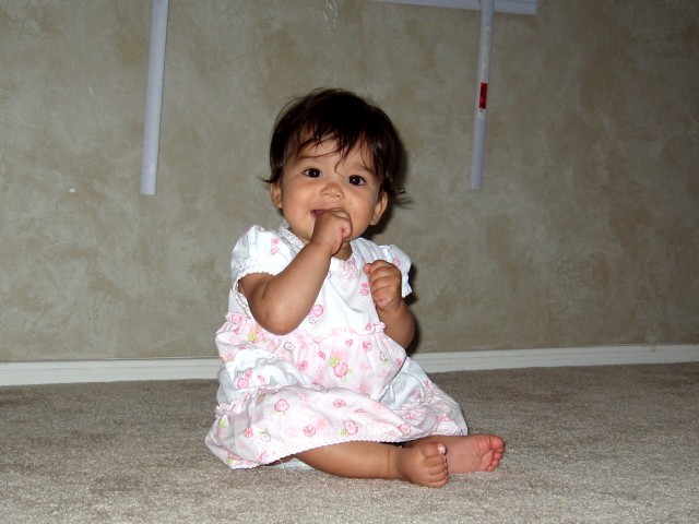 and pull herself up, she can stand unassisted for a few seconds. I'm also starting to see parts of her personality, her likes and dislikes. For example, she enjoys eating her meals at the same time as her brothers and she wants Cheerios to be served with most meals. I think it makes her feel like a big girl. Although she is often easy going, she will let you know if you do something she does not like, i.e., send her brothers out to play and leave her indoors, etc. The funny thing is, I don't recall either one of my boys being so opinionated at this tender age. I realize that there are several pictures of the similar pose but bear with me... I'm just one of those proud, gloating moms showing off one their precious children! |