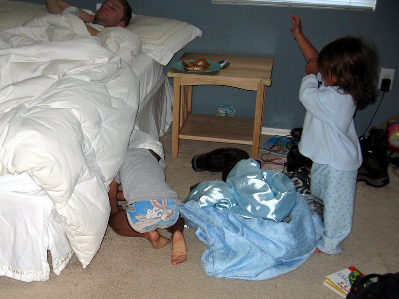 Caitlin rolls up her sleeves to help Aidan get daddy's gift from under the bed.