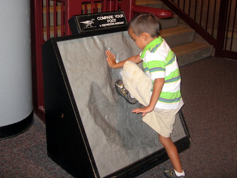 Aidan comparing his hand and foot to the Southwest Hadrosaurus.