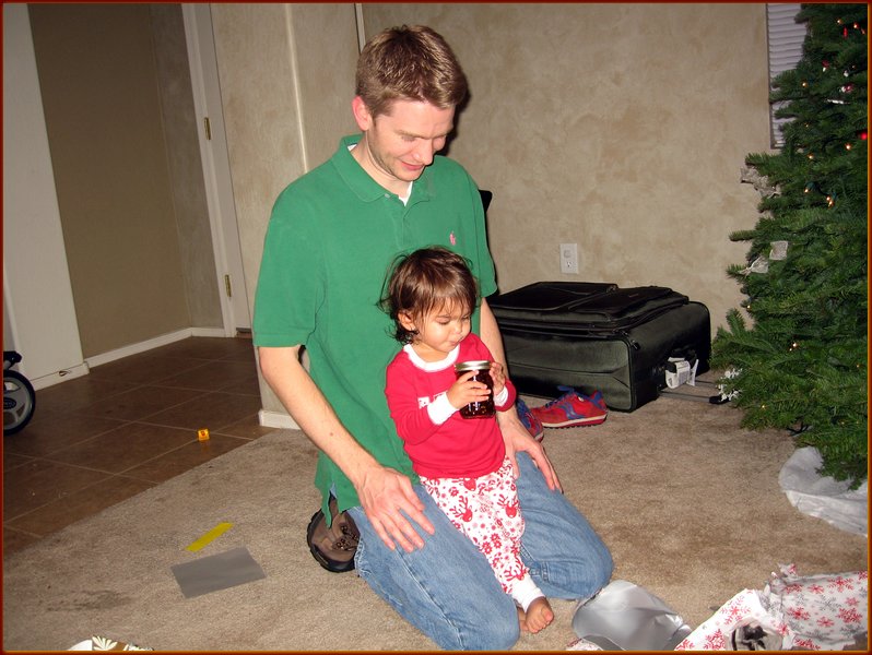 Daddy is a great person to lean on when you need to examine a jar of jam.