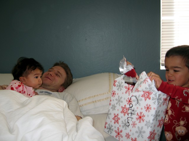 Caitlin, watching Aidan open her gift while she lounges on Daddy.