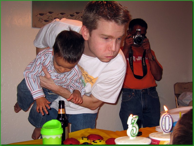 William blows the candles on his birthday ice cream while Mark tries to grab the beer.