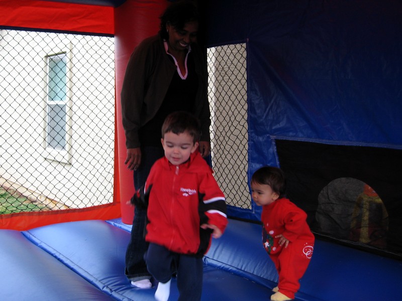Acchi watches as Aidan and Mark test out the bouncy house before the guest arrive.